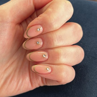 Chrome details called for Helena, who sought a gold, sparkly mani to complement her Scratch Stars Party outfit. Rebecca Ellis of Beauty By Beck, Dartford, used a shimmery builder gel to enhance Helena’s natural nails, topped with a double French-style in gold chrome paint. The look was finished with stars and Bluestreak Crystals gems.