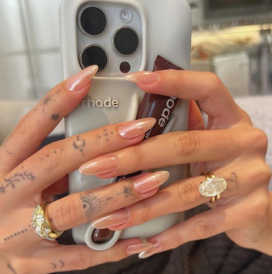 In 2022, Hailey Bieber debuted her iconic ‘glazed donut’ nails, courtesy of nail tech, Zola Ganzorigt of @nailsbyzola. The subtle, pink-toned chrome manicure quickly went viral, sparking a wave of demand for chrome finishes among salon-goers.