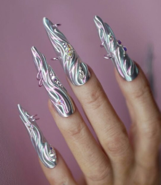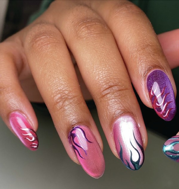 Cat eye and chrome finishes combine in this flaming design by Birmingham nail tech, Abbi Rogers.