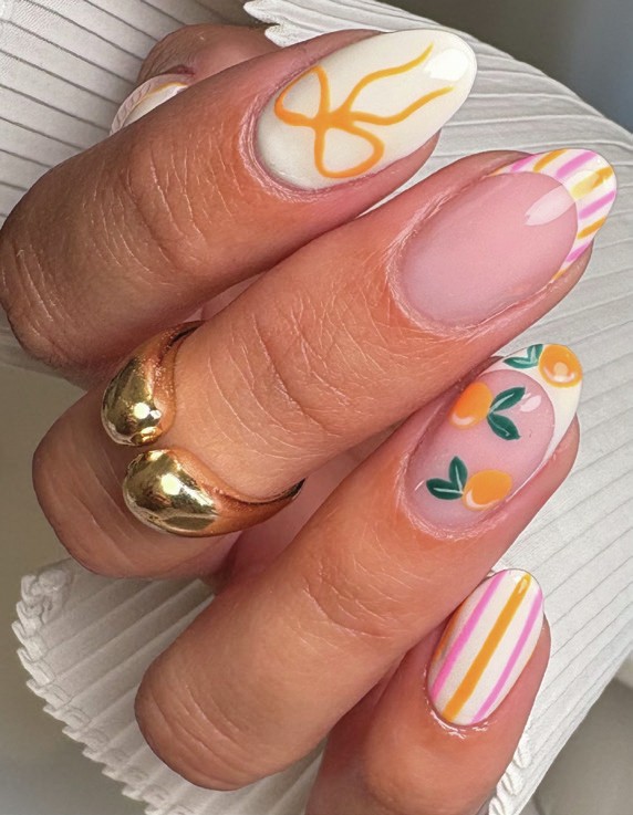 Lecenté Creator, Sarah Gooderham, created this citrus sweet manicure, combining hand-painted oranges with a pretty bow.
