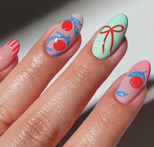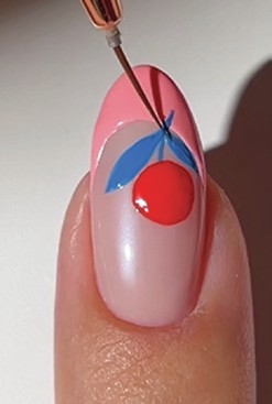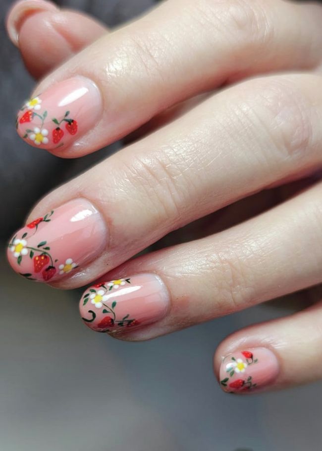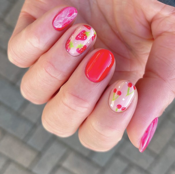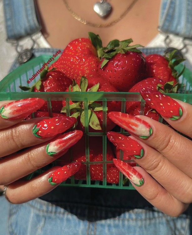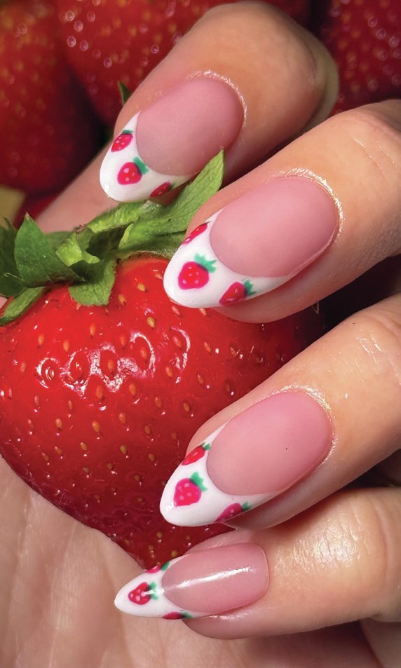 2025, Sophie Donaldson, combines summer nail trends by hand-painting strawberry plants at the tips of her client’s nails.