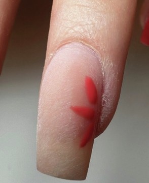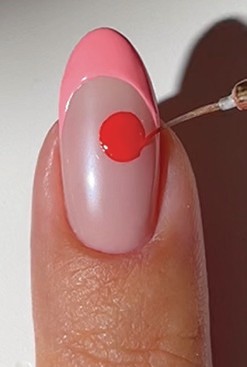 Step 2 Using a liner brush and coral-red gel polish, paint a circle on the upper right side of the nail. Cure.