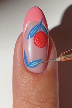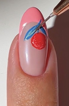 Step 4 Swap to a pastel mint gel polish and create thin lines within the leaves and on the lower side of the coral circle to add definition. Cure.