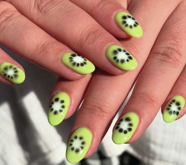 The team at Shoreditch salon, N’DAO Shoreditch, hand-painted the inside of a kiwi on nails for a fresh and fruity finish.