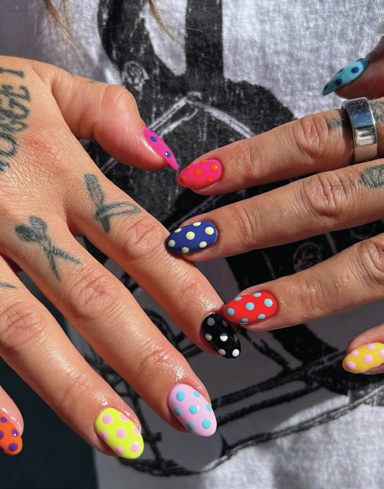 Different coloured polka dots feature in this manicure by @getnailedkelowna of British Columbia.