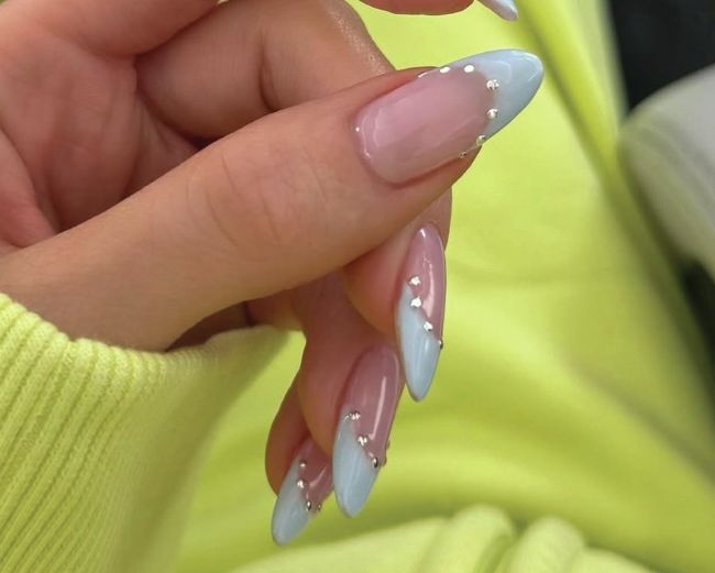 Reality star & entrepreneur, Kylie Jenner, recently opted for studded, pastel blue nail tips, courtesy of LA nail artist, Zola Ganzorigt of @nailsbyzola. Scan to watch a step-by-step guide to creating the look.