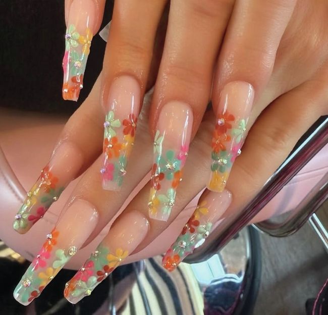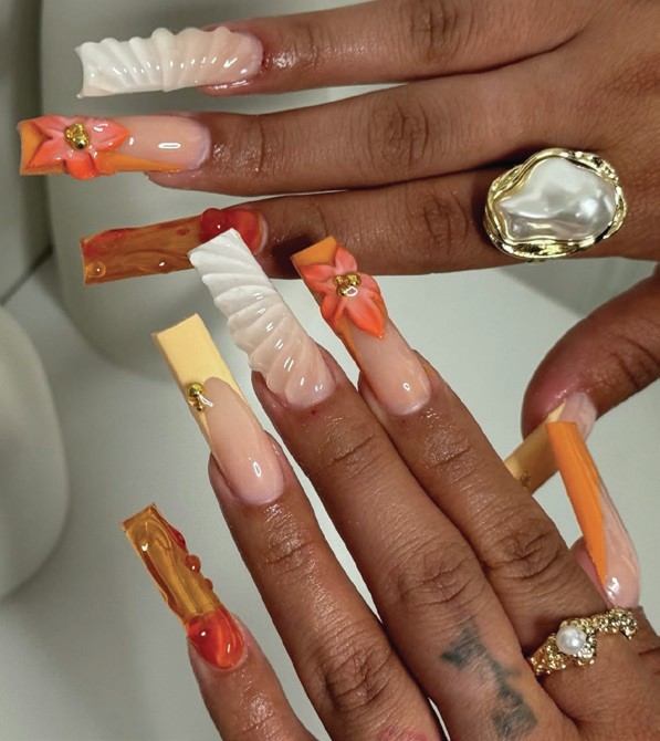 LA-based nail artist, @inesxnails, features a 3D orange flower on long, square-shaped enhancements.