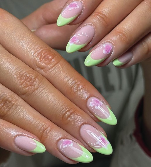 Green and pink hues complement each other in this French-inspired summer manicure, featuring hibiscus flowers by Leah of @leahbeautyrhitreat.