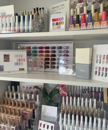 My studio is floral-themed, and I fill it with inspiration, pictures and items for clients to enjoy looking at during their appointments. I love Japanese and Korean nail products, so showcase swatches of these.