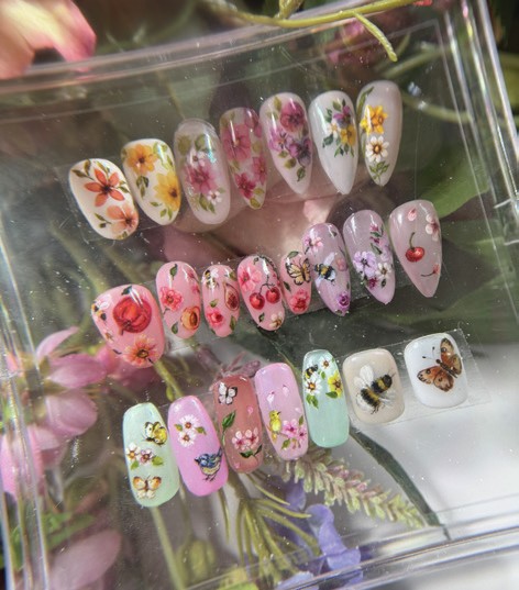 I came across the world of nail art during the pandemic. I was furloughed and shielding due to having cystic fibrosis, and while scrolling on Instagram, I happened upon a floral nail design. I was instantly obsessed! It was a perfect time to work on my nail skills, as many techs were running online nail art workshops. I practiced on tips, immersed in as many tutorials as I could and fell in love with nail art. As soon as restrictions lifted, I trained to qualify as a nail tech.