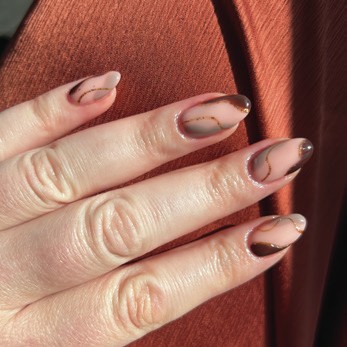 Helena indulged in a chocolate brown and taupe nail design: perfect shades for autumn, courtesy of Dartford-based nail pro, Rebecca Ellis (@beckthenailteck). Never one to shy away from sparkle, details were added using gold glitter gel polish.