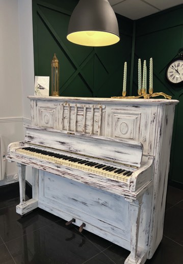 The salon was refurbished in 2020, incorporating green, white and gold accents. The iconic piano reception desk was bought by Aysana and her husband in 2015. “We didn’t know where it was going to go at the time, so we stored it in the garage of our rented flat,” she reveals. “When we walked through the salon space, we joked about bringing it in – then we actually did!”