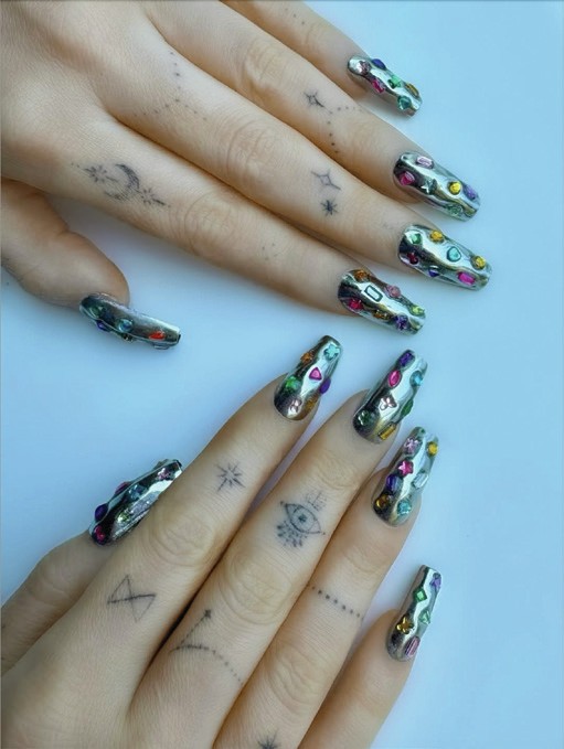 Nail artist, Brittney Boyce (@nails_of_la), adorned the nails of actress, Megan Fox, with silver chrome and gemstones.
