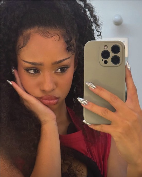 Manon Bannerman, member of girl group, KATSEYE, showed off a silver nail style by NYC nail artist, Naomi Yasuda (@naominailsnyc).