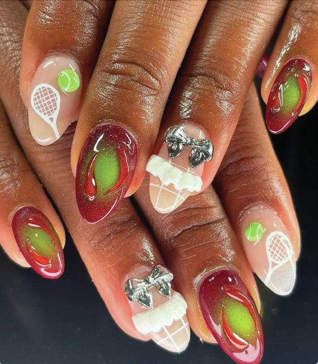 American tennis player, Coco Gauff, sported these terrific tennis talons for the US Open, created by Isa Bone of @babybonenails.
