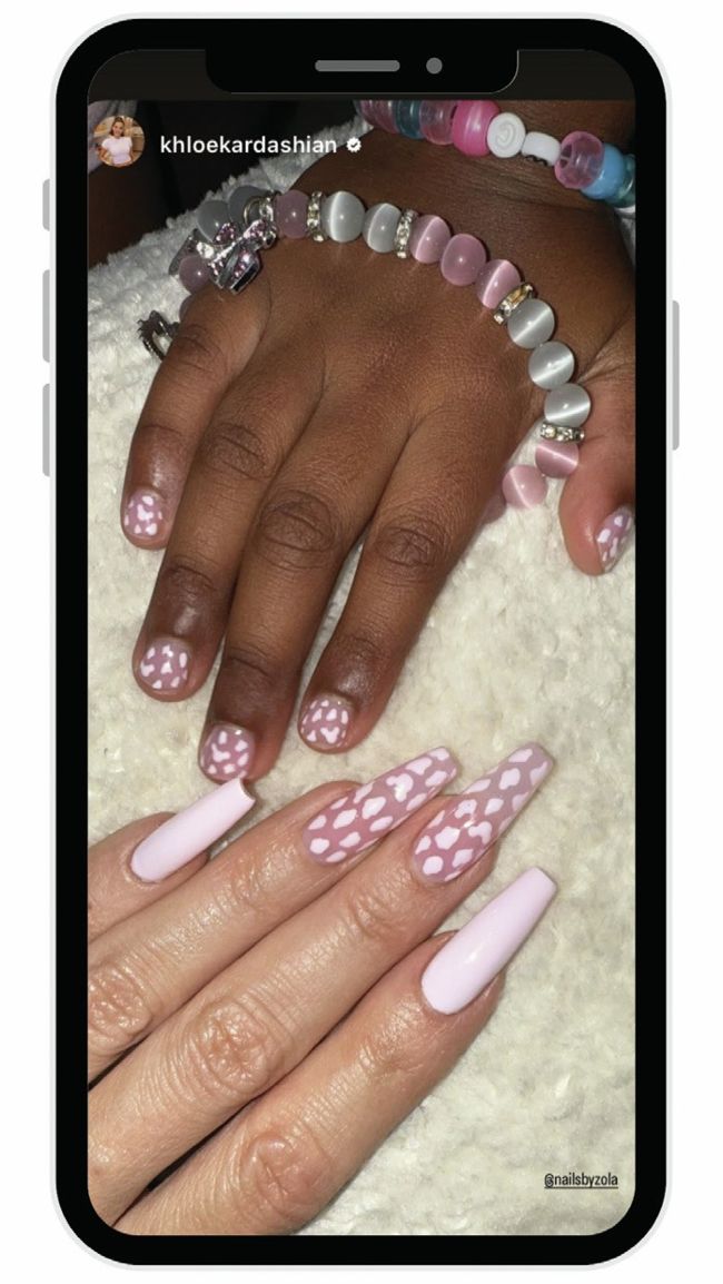 Khloé Kardashian and daughter, True Thompson, twinned with baby pink manis by Zola Ganzorigt (@nailsbyzola), which Khloé posted to her Instagram story.
