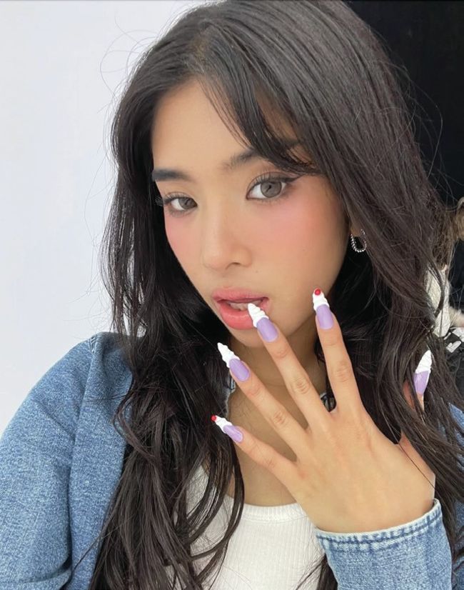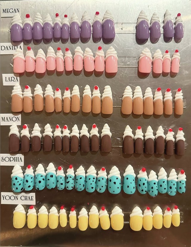 NYC’s Naomi Yasuda created the nail looks for the now-viral GAP advert, featuring girl group, KATSEYE. Each member’s nails showcased a milkshake design, with band leader, Sophia Laforteza (pictured), sporting a lilac variation with 3D whipped cream art and a cherry on top.