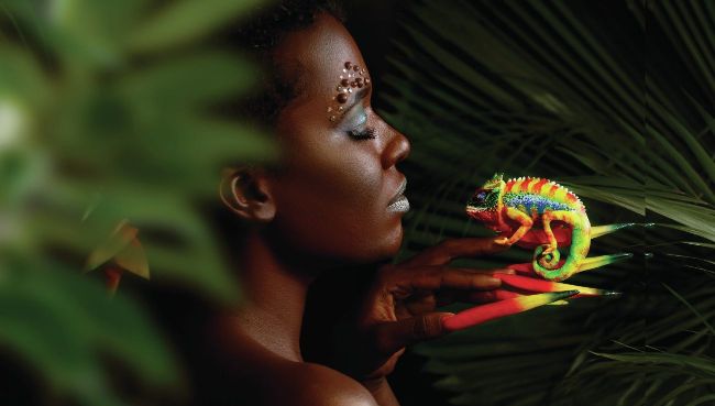 The decision to feature a Black woman in this artwork was deeply intentional. I could envisage how the chameleon’s radiant colours would come alive against her skin, and the contrast felt powerful, elegant and full of emotion. To me, it represents confidence, pride and individuality, and is a reminder that beauty has no single form or shade.