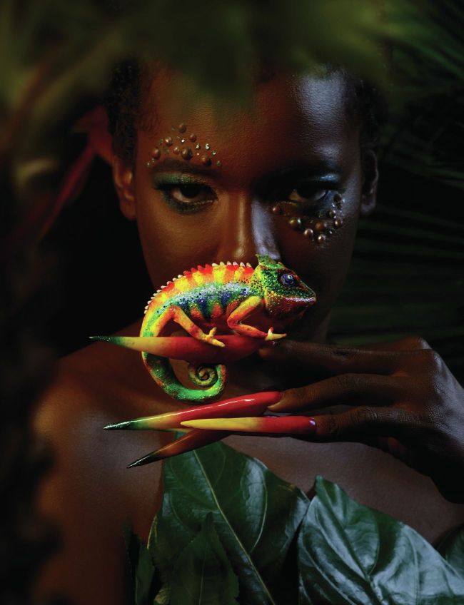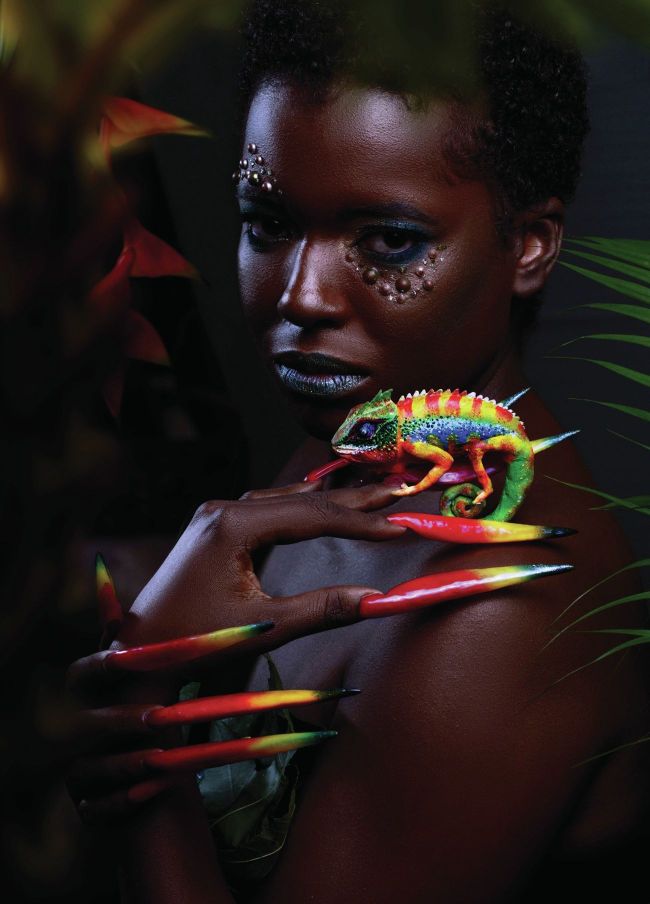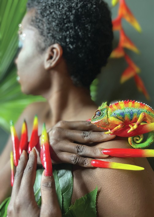 This photo shoot features one of my most meaningful creations: a design that celebrates transformation, beauty and strength. I hand-sculpted the chameleon using L&P acrylic, carefully building the layers using a fine brush. It was a slow, detailed process that demanded patience, but I loved watching the creature take form: from the curve of its tail to the shimmer of its skin.