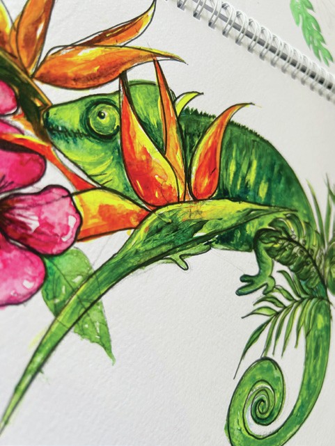 Before creating this fantasy nail piece, I spent years drawing and painting chameleons in watercolour and exploring their forms, textures and moods. Those sketches helped me understand the grace and mystery behind their movements, and when the time came to translate that onto nails, I already knew exactly what story I wanted to tell.