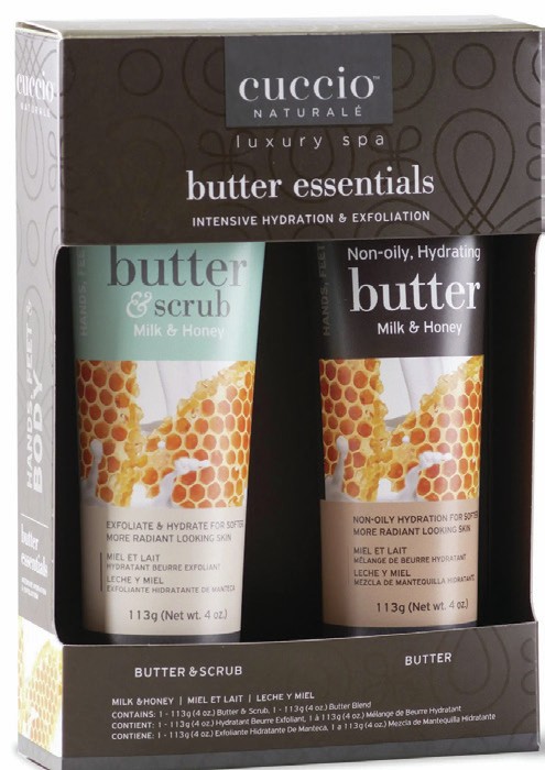 www.cucciobeauty.co.uk Cuccio’s Milk & Honey scent is infused in both products within the Butter Essentials Duo Pack. The Butter & Scrub provides exfoliation and radiance, while the Butter boasts a non-oily, hydrating formula for intensely soft, smooth skin.