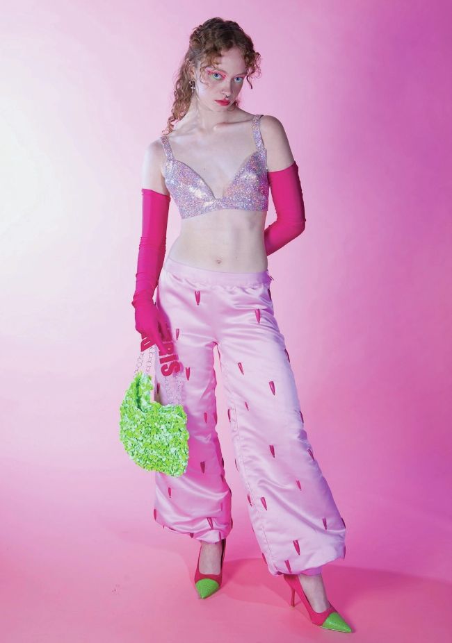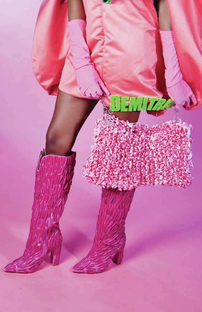 To add a ‘unique and witchy edge’, Demitris hand-applied over 5,000 stiletto nail tips to his garments and accessories, in pink, green and glittery hues. “When researching stereotypical imagery of witches, I noticed a recurring detail: they almost always have long, pointed fingernails,” he explains. “They’re exaggerated, almost claw-like, and they instantly communicate danger, strength and a kind of untouchable glamour.