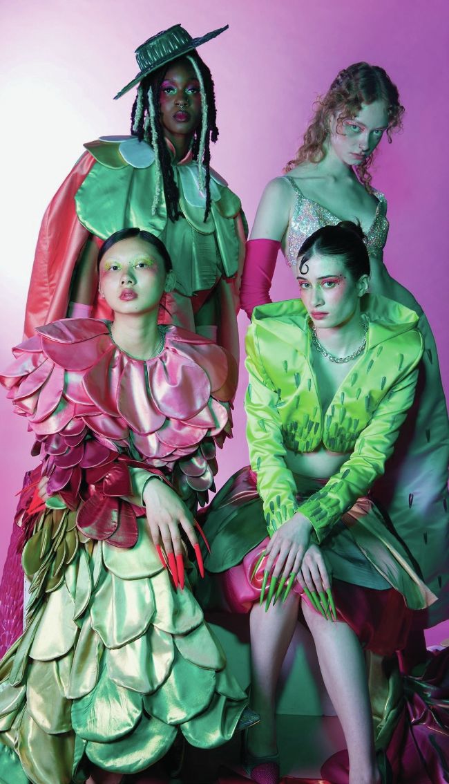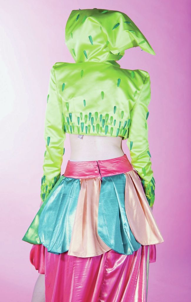 “I wanted to take the themes in a fresh, theatrical direction for my clothing creations,” Demitris explains. “The project was inspired by the various portrayals of Glinda the Good Witch and the Wicked Witch of the West in the 1939 Wizard of Oz film and the Broadway show, Wicked. I drew on the musical’s famous line: ‘pink goes good with green’.”