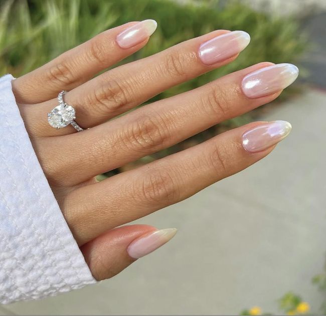 “Glazed donut nails incorporate a pearly chrome finish layered over a sheer nude or pink, achieving a chic, shimmery effect,” says Sara Pinto. Propelled into popularity by Hailey Bieber’s go-to tech, Zola Ganzorigt (@nailsbyzola), this trend remains popular