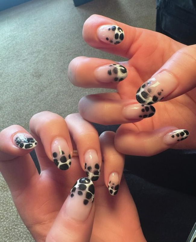 Singer, Dua Lipa, wore a French mani topped with black blooming gel art. She called upon NYC-based nail artist, Mei Kawajiri of @nailsbymei, to create the look.