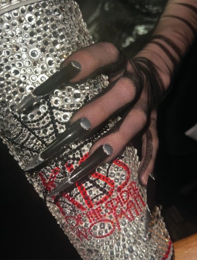 Jennifer Lopez donned dark, elongated extensions courtesy of Elle Gerstein (@enamelle) on the set of the Kiss of the Spiderwoman film. The look was created with Aprés Nail 3XL Stiletto Gel-X Tips and Astral Gel Couleur in High Priestess.