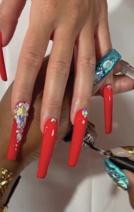 Saweetie sported long, red enhancements by Temeka Jackson of @customtnails1 for a collaboration with ESPN. The rapper & singer has become the first female artist to partner with the sporting network for an NFL season.
