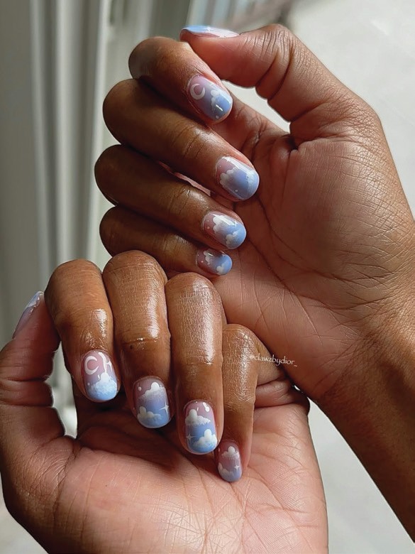 Actress & comedian, Jessica Renee Williams, wore cloud-coated nails, featuring a sky blue ombré base and white nail art crafted by Mycah Dior of @clawzbydior_.