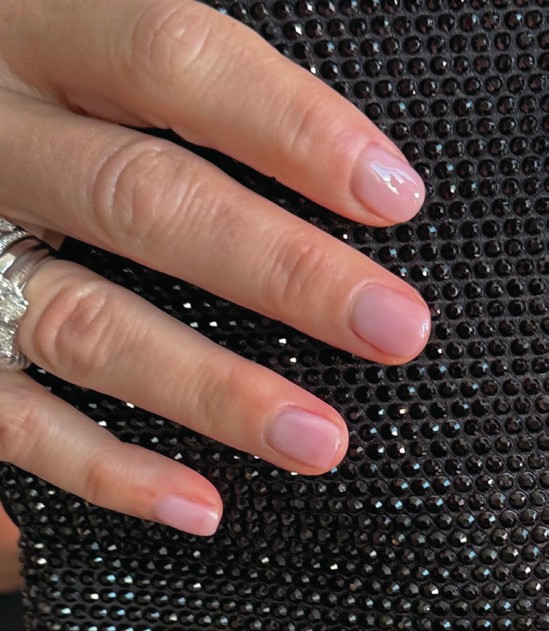 Nail artist & content creator, Queenie Nguyen, enveloped the nails of actress, Kristen Bell, in Aprés Nail Light & Shadow Sheer Gel Couleurs in Morning Sighs and Purple Moon to create a ‘my nails but better’ finish.