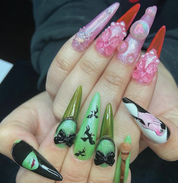 A client of LA’s @fresh.claws paid homage to Elphaba and Glinda, with a green nail style on one hand and pink design on the other.