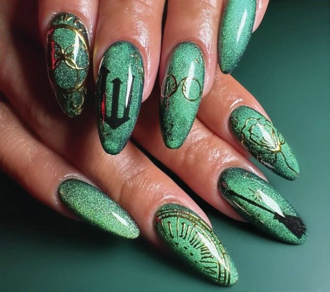 A green cat eye hue creates a magical and mysterious base for chrome art, a broom and the