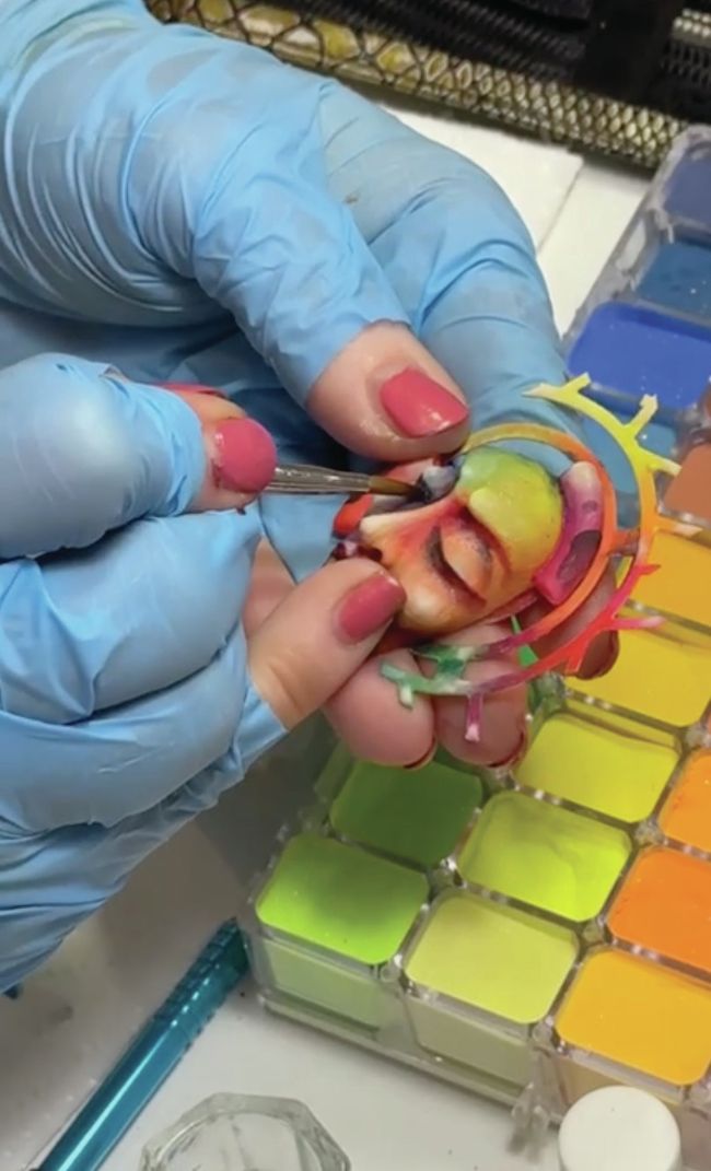 My main tools are nail brushes, and I use many kinds – though mainly for L&P acrylic. I have a long history using the system and continue to promote and praise it. I believe that acrylic is the most pliable product for creative work. You can sculpt and paint with it, and when creating three-dimensional elements, it conveys texture amazingly.