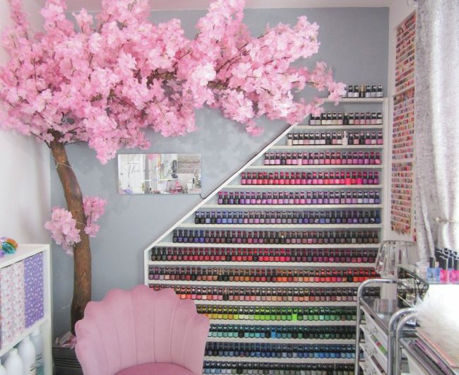 The art of Nails – Nail Artist is a relaxing space with a pink colour scheme and striking faux cherry blossom tree. A carefully curated collection of gel polishes, pigments and glitters is displayed on shelves and magnetic boards, alongside nail art inspiration. “It took years to build my collection, and I stay up-to-date with trends to ensure I can achieve all client requests,” Tina says.