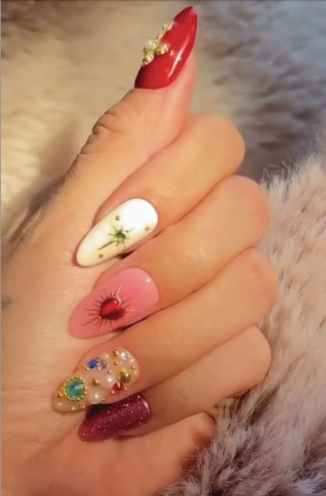 Singer & actress, Selena Gomez, showcased a mix ‘n’ match mani by celebrity nailist, Tom Bachik. The star opted for a playful array of nail art with gembellished accents. Bachik uploaded a snap of the look to Instagram, calling it a ‘Romeo & Juliet jeweled icon mani’.