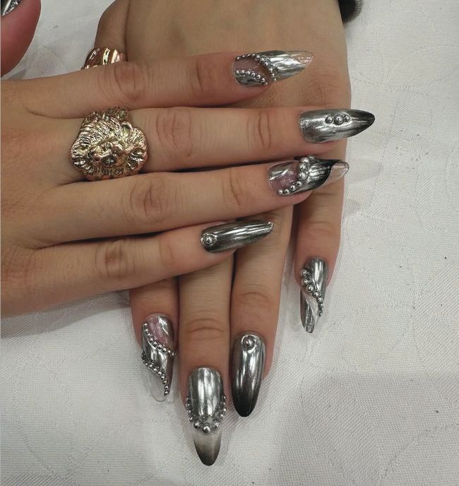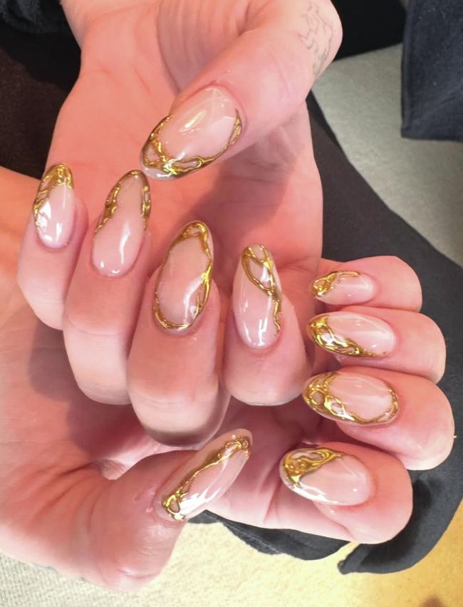 Dua’s chrome claws Dua Lipa rocked nude nails with golden accents thanks to NYC nail artist, Mei Kawajiri, who added gleaming chrome details across the enhancements.