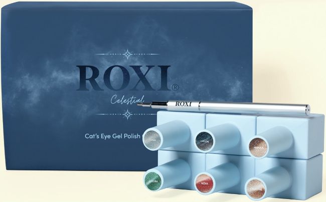 Add depth and dimension to nail designs with a choice of six stunning cat eye gel polish shades from Roxi. The Celestial Collection includes Aurora, Celestial, Luna, Nova, Nebula and Orion, and the Roxi Magnet Tool. The highly pigmented gel polish formula shifts and moves with the strokes of the tool, allowing you to form crisp beams, soft gradients or halo finishes.