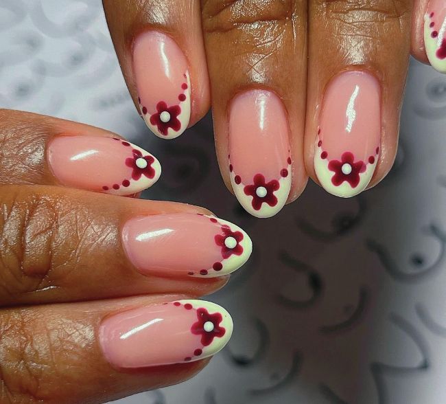 Lianne Burgess, owner of Killer Queens nail salon in Kidderminster, creates a floral French up twist. She combines classic Valentine’s shade, burgundy, with pastel green.