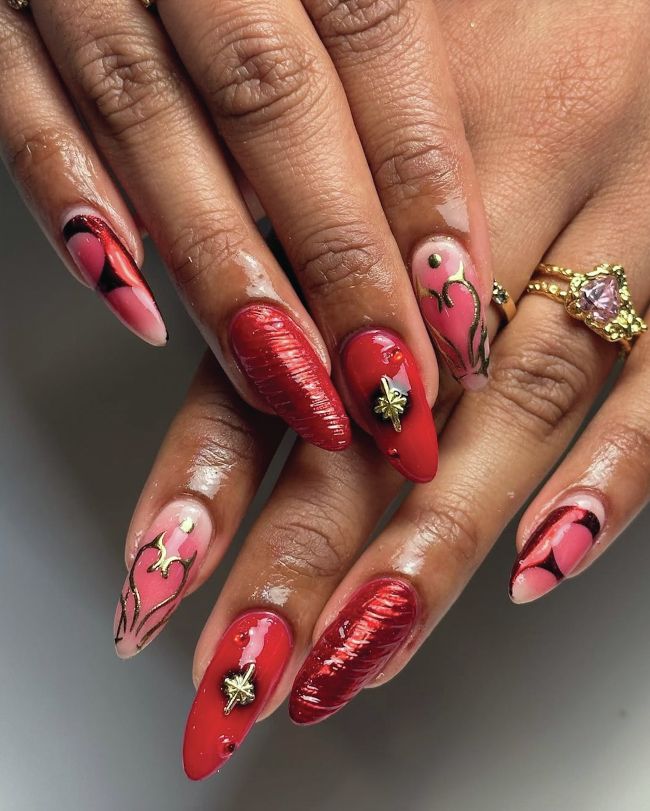 Luxury press-on nail artist, Laura Gilbert-Anderson of @basicwitchnailz, turns the heat up on Valentine’s nails, with flame effects and a classic crimson shade.