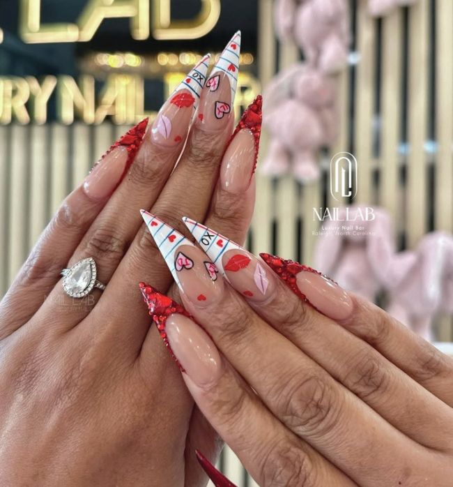 Passing notes to your crush might just be the height of romance. Notebook paper-inspired French-style tips and personalised doodles take centre stage in this design by North Carolina nail salon, Nail Lab (@naillabraleigh).