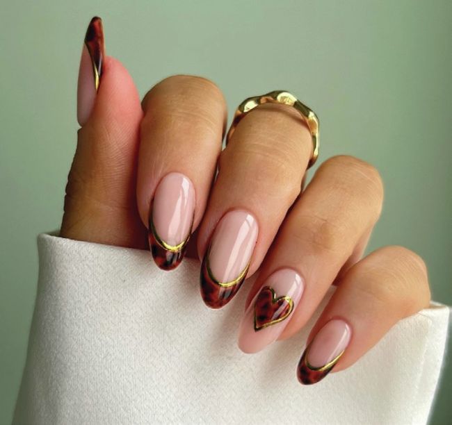 Certain colour combinations ooze elegance: including brown and gold. Swansea-based nail artist & salon owner, @iolapallade_beauty, pairs sophisticated tortoiseshell print with French-style tips and a heart outlined in chrome.