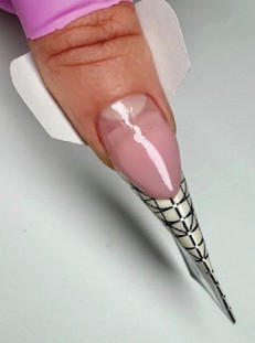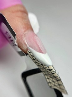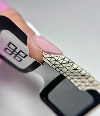 Step 2 Trim and fit a form to suit the natural nail shape, ensuring it sits flush to the free edge. For an almond shape, align the end of the form with the natural nail apex. Apply a very thin layer of clear hard gel to mark out the extended nail shape. Cure.