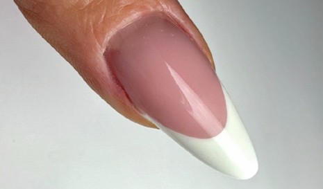 Step 7 Create the classic French tip by applying white hard gel to the free edge. Cure.