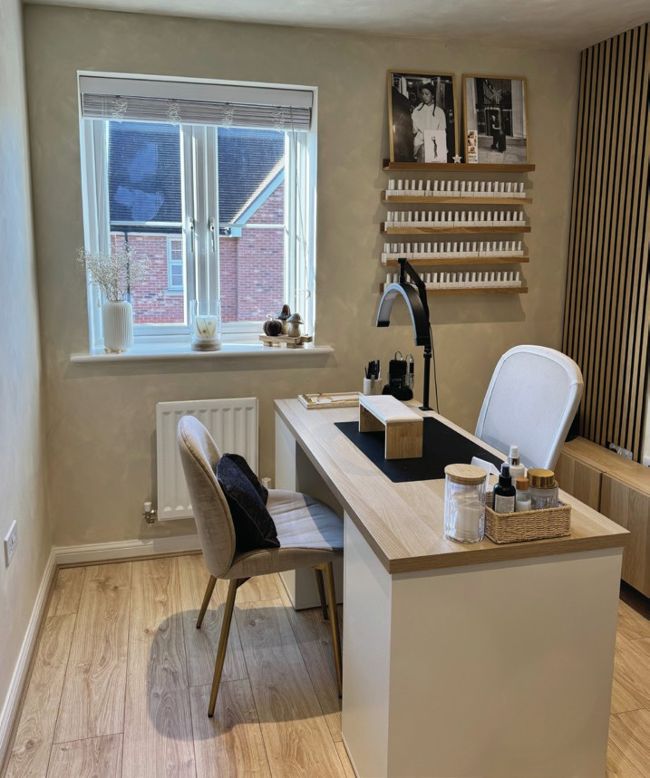“My home salon is my pride and joy,” says nail artist, Chloe May Boyce. Neutral tones and wood accents give the space a spa-like feel, while lime-washed walls – painted by the pro, add to the ambience. “Knowing that I helped decorate the salon makes me appreciate it more, because it’s built with intention, love and a whole lot of passion,” she smiles.