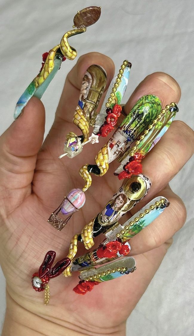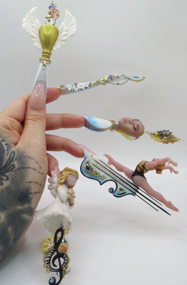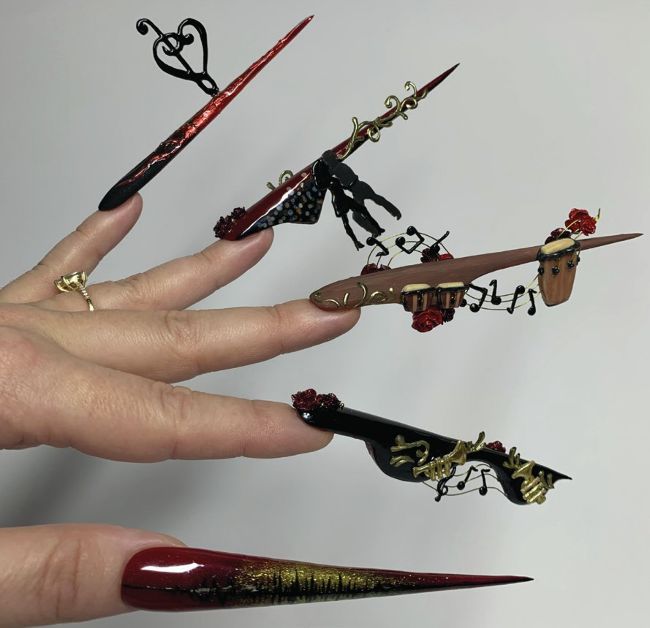 THE TASK: My Memorable Melody Create a five-nail design that functions like sponsored by five movements of a musical composition. Each nail should have its own beauty, but the overall design must form a cohesive visual story. Nails can be whatever shape desired, and the minimum length of each should be 5cm from the cuticle area to allow sufficient space for detail.