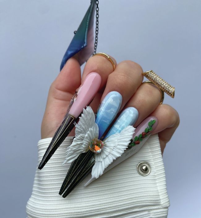 • 3D construction: use of builder gel, 3D sculpting gel, acrylic powder or similar materials to create dimensional elements.