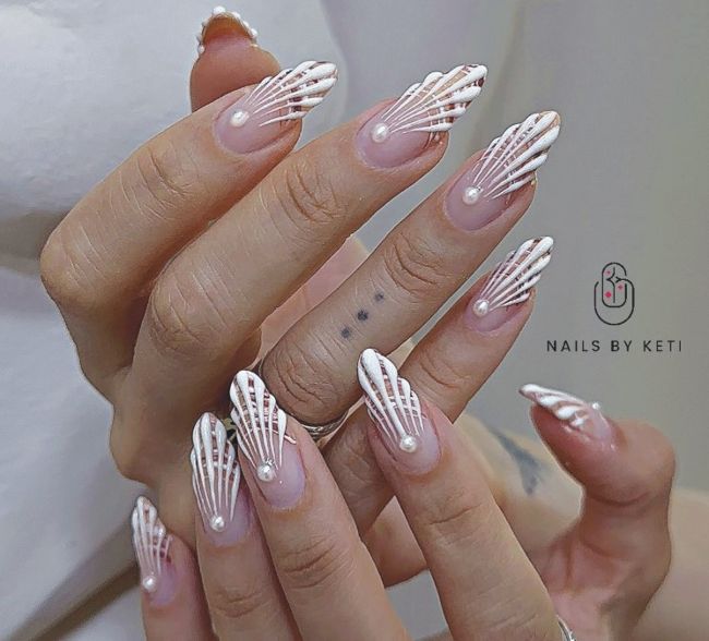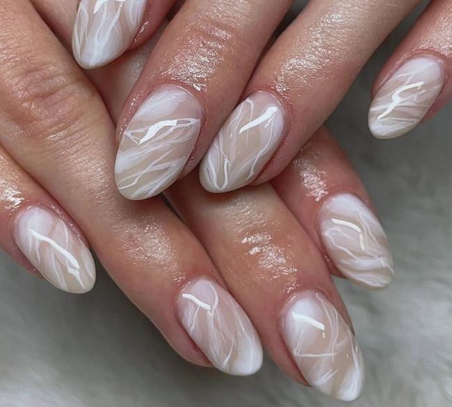 Canadian natural nail specialist, Jadyn of @_thejadeaesthetic, is behind this milky marble-effect mani with delicate white details.